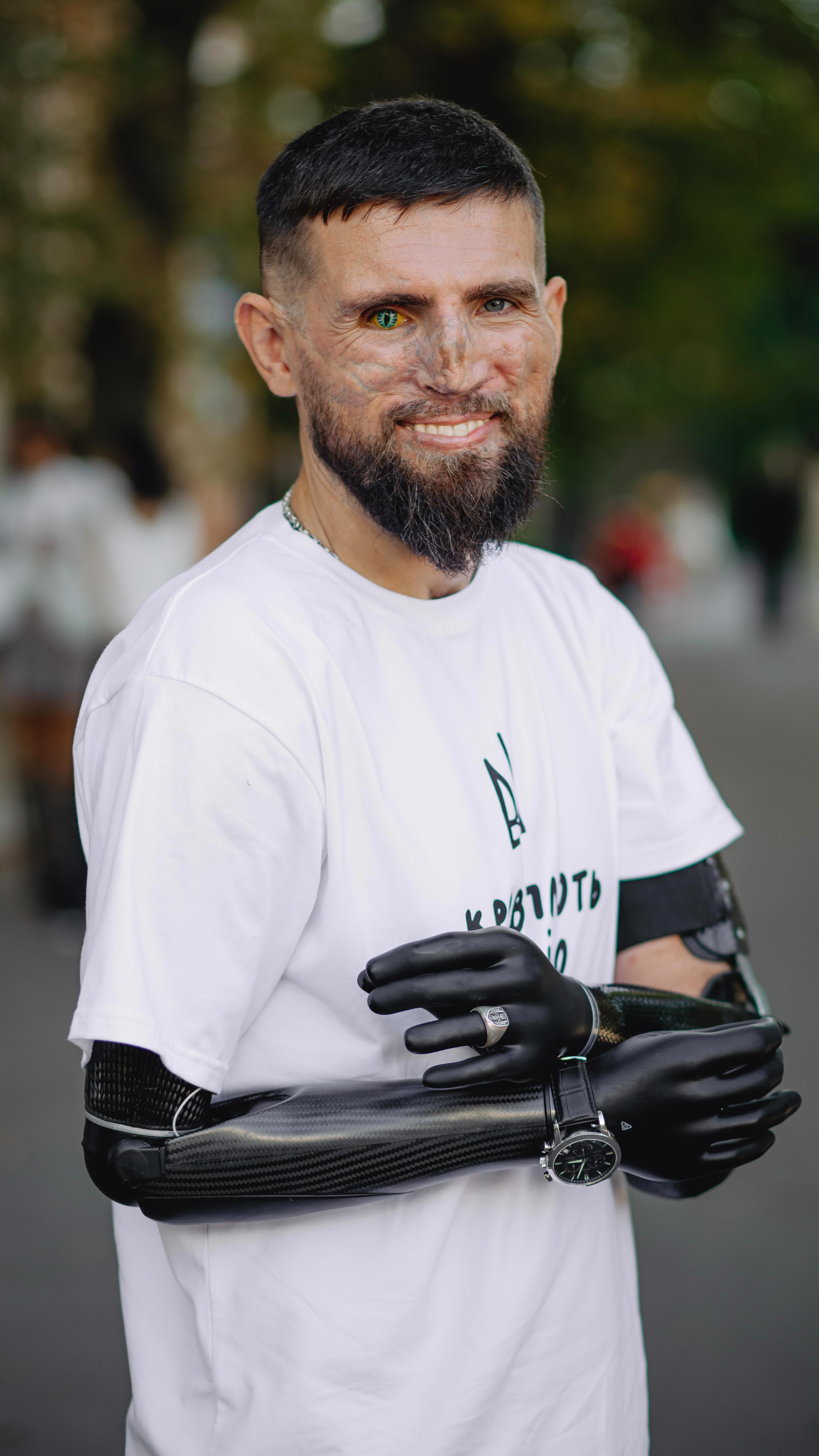 «Потім півтора місяця реанімація, евакуація в Німеччину. Повернувся в Україну, почав відновлення, поставив протез ока, відновив слух на праве вухо. На ліве вухо слух я втратив, втратив дві верхніх кінцівки, втратив нижню кінцівку праву нижче коліна», — каже про наслідки поранення ветеран.