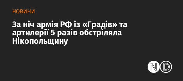 Вночі російські окупаційні війська п'ять разів ударили по Нікопольському району Дніпропетровської області з «Градів» та важкої артилерії. Про це повідомив голова Дніпропетровської ОВА Валентин Резніченко.