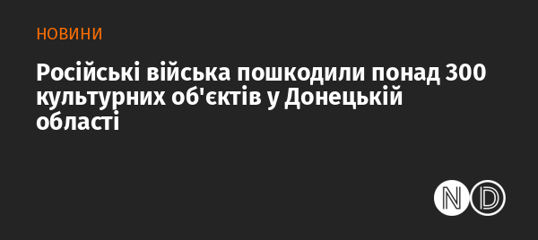 З початку повномасштабного вторгнення Росії в Україну війська РФ пошкодили 311 культурних об'єктів на Донеччині — більше, ніж в інших регіонах країни. Про це повідомляє у Facebook міністерство культури та інформаційної політики України.