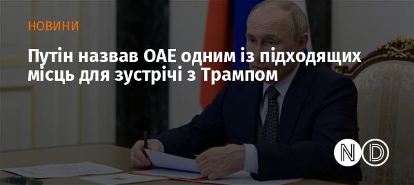 Очільник Кремля Володимир Путін заявив сьогодні, що Об'єднані Арабські Емірати є одним із відповідних місць для його зустрічі з президентом США Дональдом Трампом, передає ТАСС.