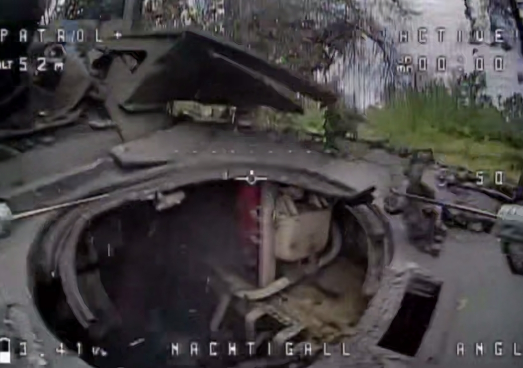 Відзначається, що українські FPV-дрони потрапили прямо в люк танка з саморобним захистом — техніка загорілася, екіпаж втік.