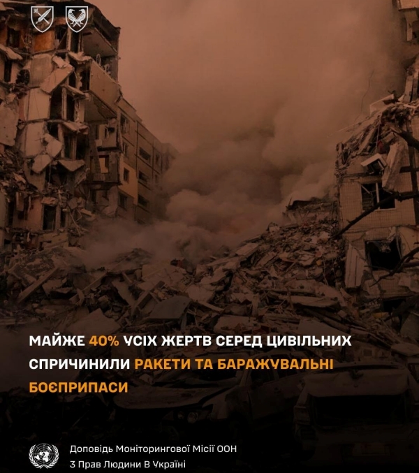 Майже 40% всіх жертв стали результатом застосування ракет і баражувальних боєприпасів. Тільки російські БПЛА за один місяць вбили 64 людини та поранили 337.