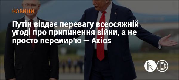 Очільник Кремля Володимир Путін надає перевагу всеосяжній угоді про припинення війни, повідомив Володимиру Зеленському і лідерам країн НАТО під час телефонної розмови президент США Дональд Трамп.
