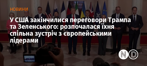 Після завершення закритої частини переговорів розпочалася спільна зустріч Зеленського та Трампа з європейськими лідерами та генеральним секретарем НАТО Марком Рютте. У переговорах з європейської сторони беруть участь канцлер Німеччини Фрідріх Мерц, президент Франції Еммануель Макрон, прем'єр-міністр Великобританії Кір Стармер, прем'єр-міністерка Італії Джорджа Мелоні, президент Фінляндії Александр Стубб та президентка Єврокомісії Урсула фон дер Ляєн.