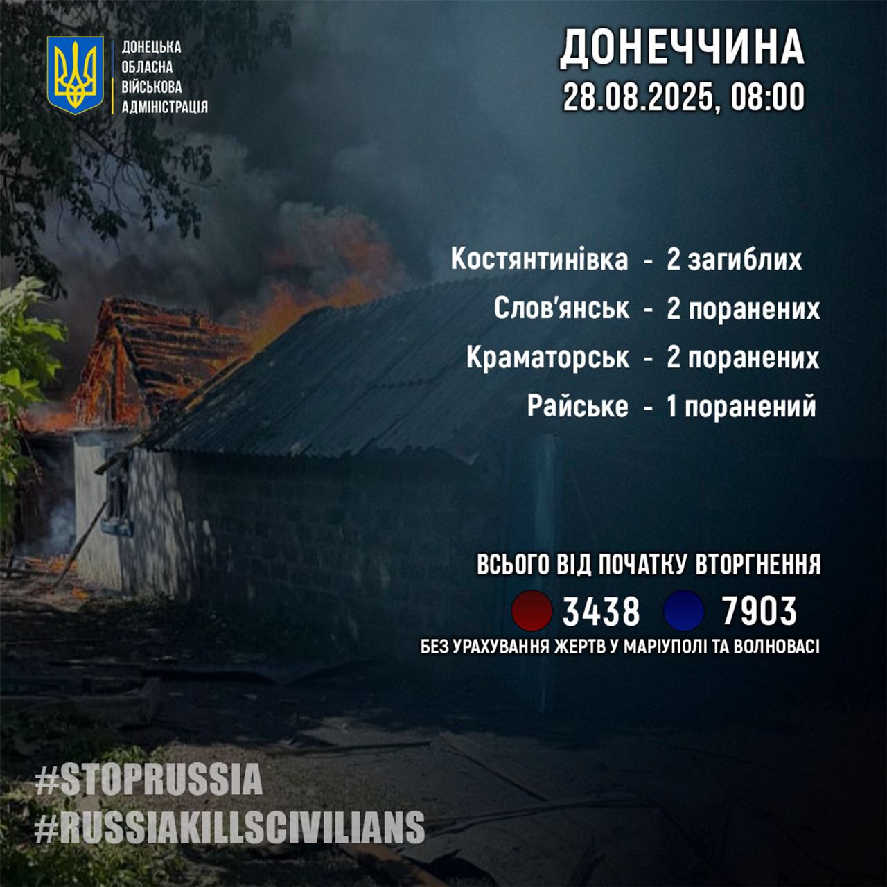 За 27 серпня росіяни вбили двох жителів Донецької області – у місті Костянтинівка. Про це повідомив голова Донецької обласної військової адміністрації Вадим Філашкін.