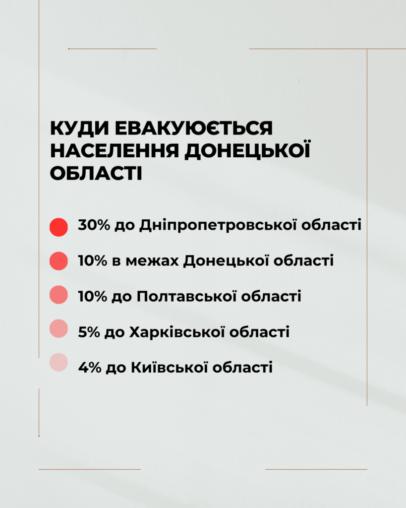 Найбільше переселенців виїхали до Дніпропетровської (30%) та Полтавської (10%) областей, а також залишилися в межах Донецької області (10%). Серед громад, звідки відбувався виїзд, лідирують Добропільська (38%), Білозерська (20%), Криворізька (12%) та Дружківська (10%).