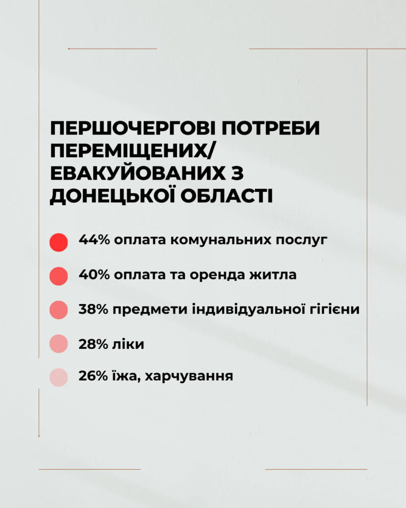 Основні потреби: оплата житла та комунальних послуг, продукти харчування, засоби гігієни та ліки. Для тих, хто не переміщався останнім часом, на першому місці залишається їжа (54%), далі — гігієнічні товари (44%), комунальні платежі (42%) та медикаменти (36%).