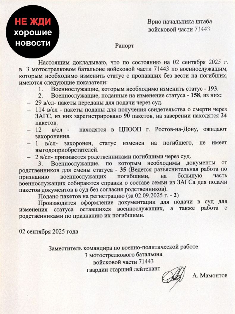 У 3-му мотострілецькому батальйоні 9-ї окремої мотострілецької бригади (в/ч 71443) зафіксовані колосальні втрати особового складу. Про це свідчить рапорт заступника командира з військово-політичної роботи гвардії старшого лейтенанта А. Мамонтова від 2 вересня 2025 року, опублікований в Telegram-каналі «Не жди хорошие новости».