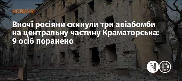 Російські окупаційні війська скинули три авіабомби ФАБ-250 із модулем УМПК на центральну частину Краматорська Донецької області вночі 14 вересня. Про це сьогодні вранці повідомила міська військова адміністрація.