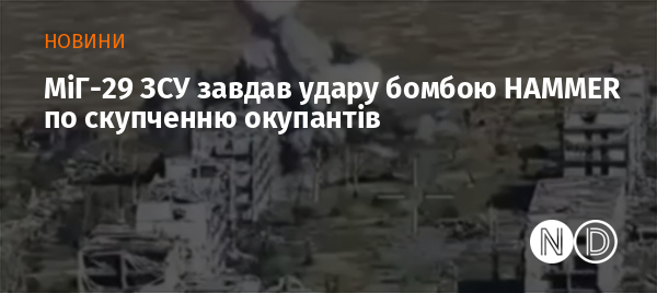 Винищувач МіГ-29 Повітряних сил України завдав удару керованою авіабомбою AASM HAMMER по скупченню російських військових. Відео удару опублікували українські військові льотчики у блозі «Соняшник».