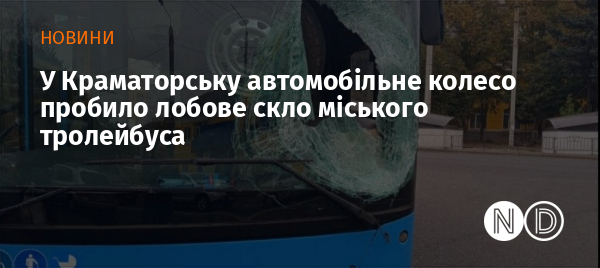 Колесо, що відлетіло з автомобіля, що рухалося зі швидкістю, пробило лобове скло міського тролейбуса в Краматорську Донецької області. Про це сьогодні повідомили місцеві канали, супроводжуючи інформацію фотознімком.