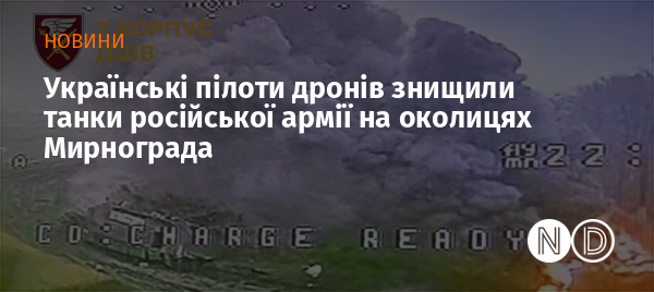 Оператори безпілотників знищили два російські танки на околицях міста Мирноград Донецької області. Про це повідомили у пресслужбі 7-го корпусу Десантно-штурмових військ ЗСУ.