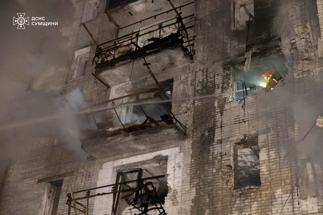 В Охтирці Сумської області російські ударні БПЛА завдали кількох ударів по 9-поверховому житловому будинку, повідомили в ГУ ДСНС у Сумщині.