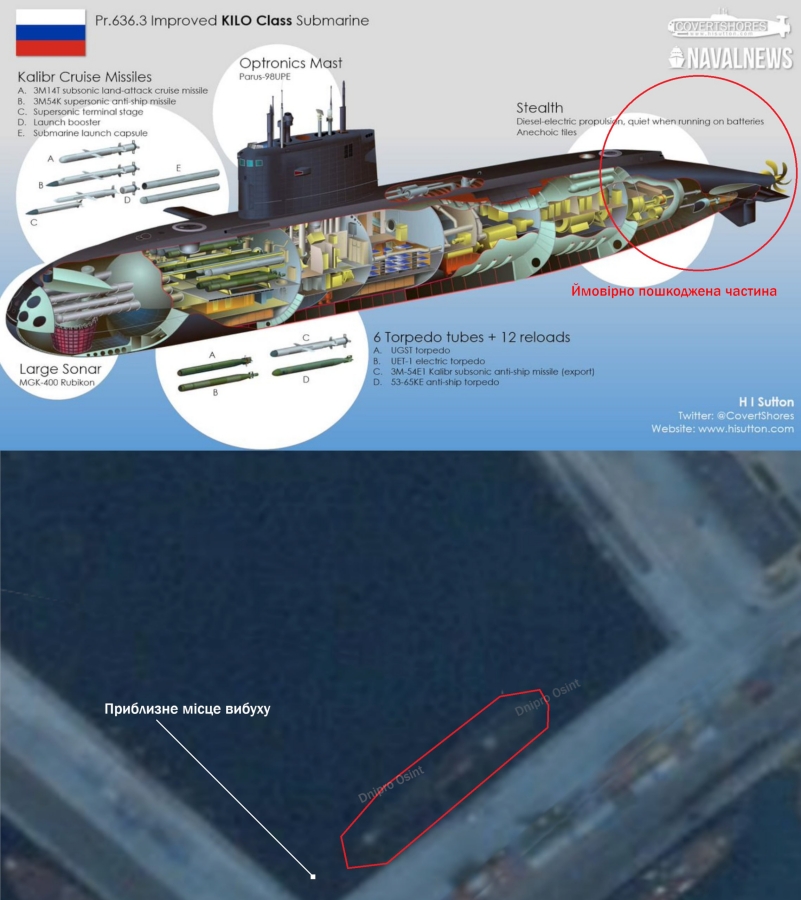 З подібною оцінкою виступив і аналітичний ресурс «Око Гора ✙». Там зазначають, що удар, імовірно, припав на моторне відділення підводного човна — зокрема в районі гвинта, що могло суттєво вплинути на його хід та боєздатність.