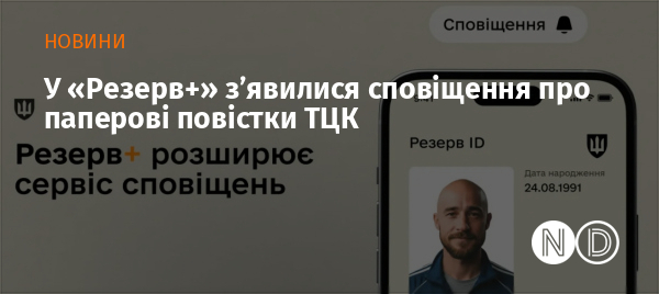 У застосунку «Резерв+» запровадили нову функцію — користувачі можуть увімкнути сповіщення про те, що територіальний центр комплектування та соціальної підтримки надіслав паперову повістку поштою. Про це повідомила пресслужба Міністерства оборони України.