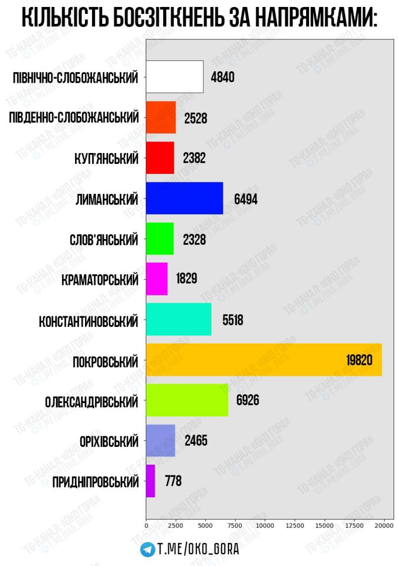 Для порівняння, на другому місці — Олександрівський напрямок з 6 926 бойовими зіткненнями (12,39%), а на третьому — Лиманський, де зафіксовано 6 494 зіткнення (11,61%).