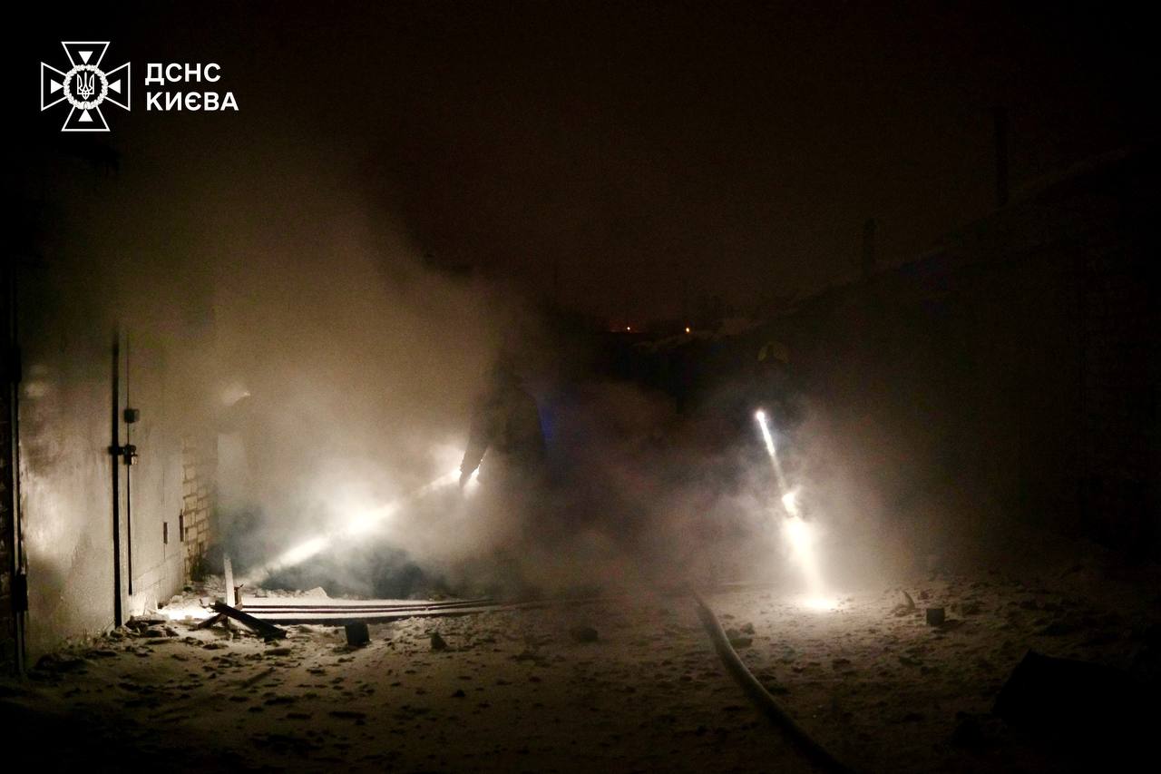 У Дарницькому районі у дворі житлового будинку сталося падіння дрону. Частково пошкоджено одноповерховий магазин поруч та скління вікон біля розташованого дев'ятиповерхового житлового будинку. Також сталося загоряння у двох житлових будинках та гаражах.