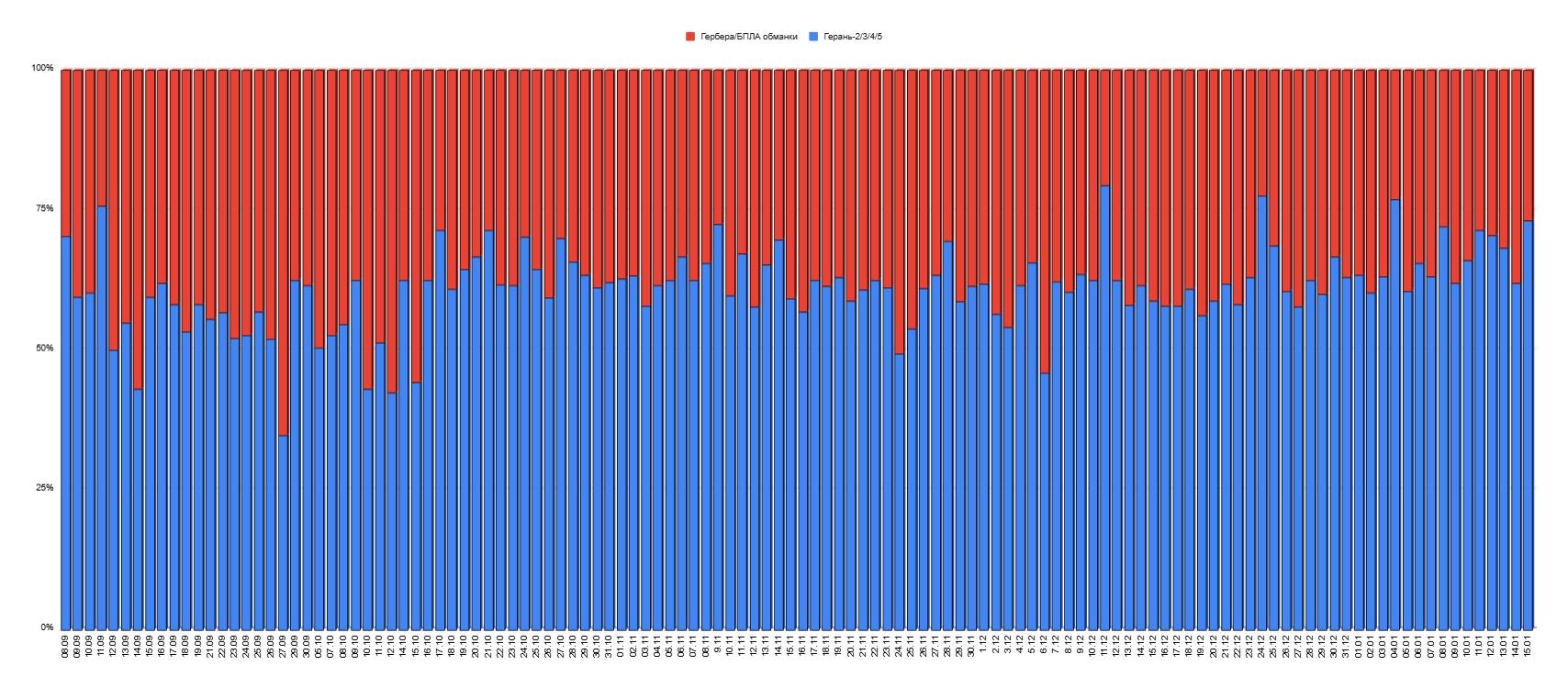 Згідно з узагальненими даними звітів Повітряних сил ЗСУ, в середньому зі 100% дронів, які РФ щодня запускає по Україні, близько 65% складають ударні БПЛА «Герань-2/3/4», тоді як приблизно 35% припадають на «Гербери» і так звані дрони-обманки, призначені для перевантаження системи ППО.
