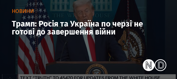 Президент США Дональд Трамп заявив, що ані Росія, ані Україна поки що не демонструють одночасної готовності до завершення війни. За його словами, сторони конфлікту почергово не готові до мирних переговорів.