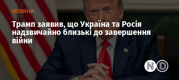 Президент США Дональд Трамп заявив, що Україна та Росія надзвичайно близькі до завершення війни. За його словами, Штати наблизилися до того, щоб привести сторони до перемир'я.