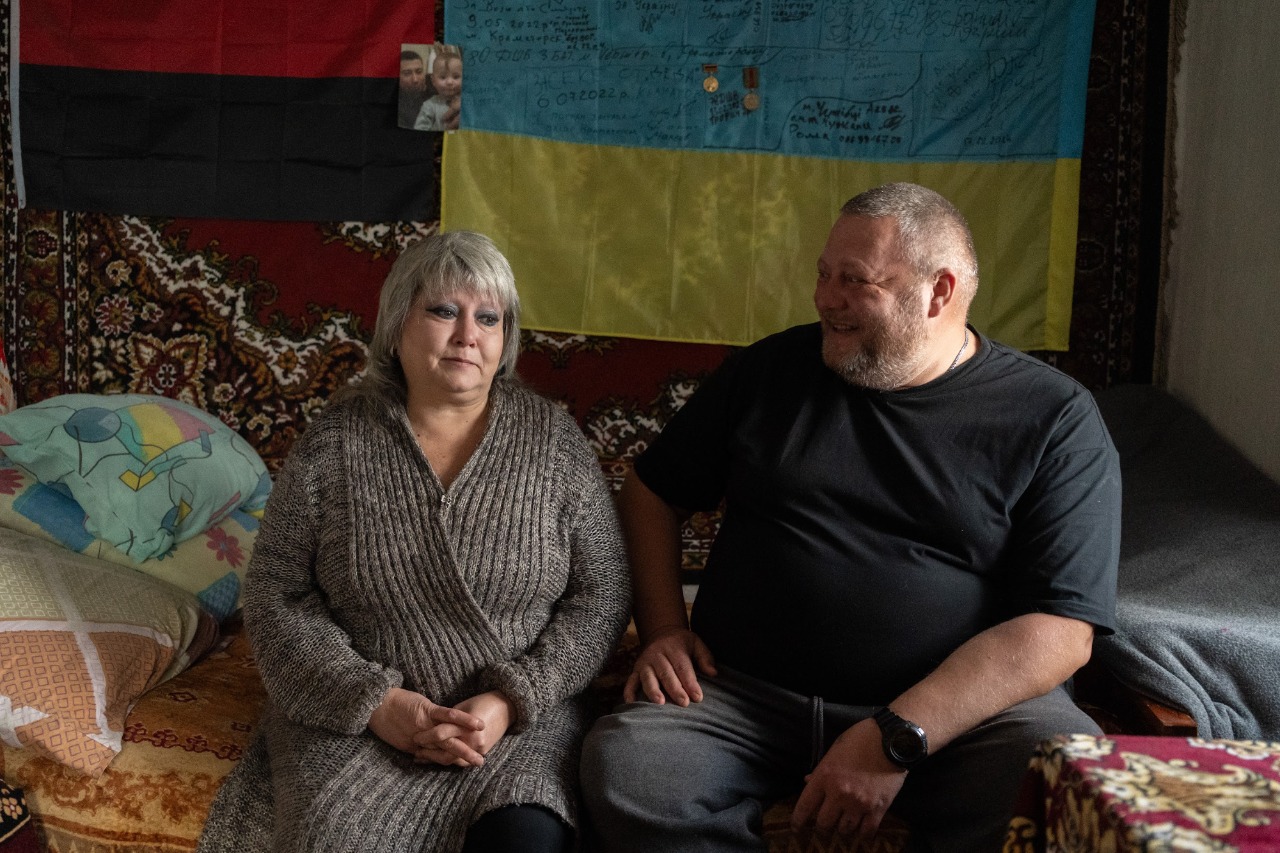 На стене в дмитровском домике тоже висят сшитые Линой украинский и красно-черный флаги. На их фоне супруги позируют нам для фотографии.