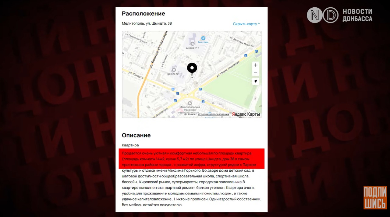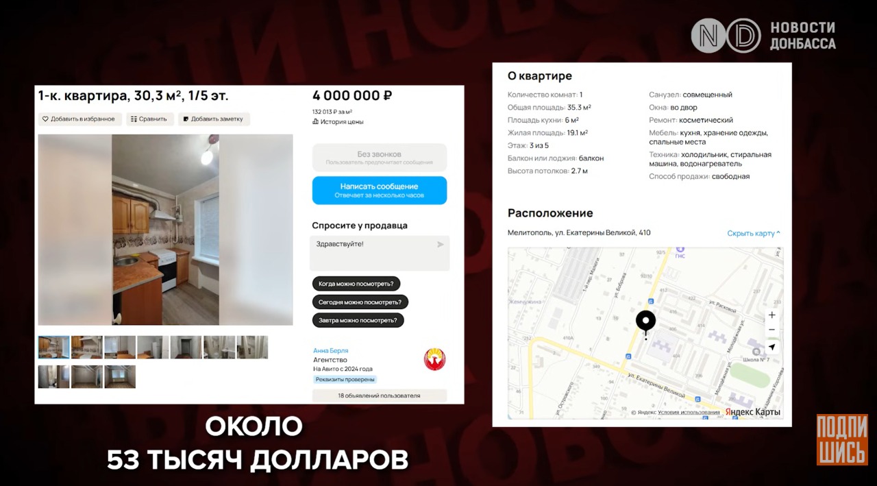 «Сегодня в Мелитополе за хорошую квартиру могут попросить и 10 млн рублей, а за дом — и несколько десятков миллионов», — говорит в комментарии пропагандистским СМИ один из местных риелторов.