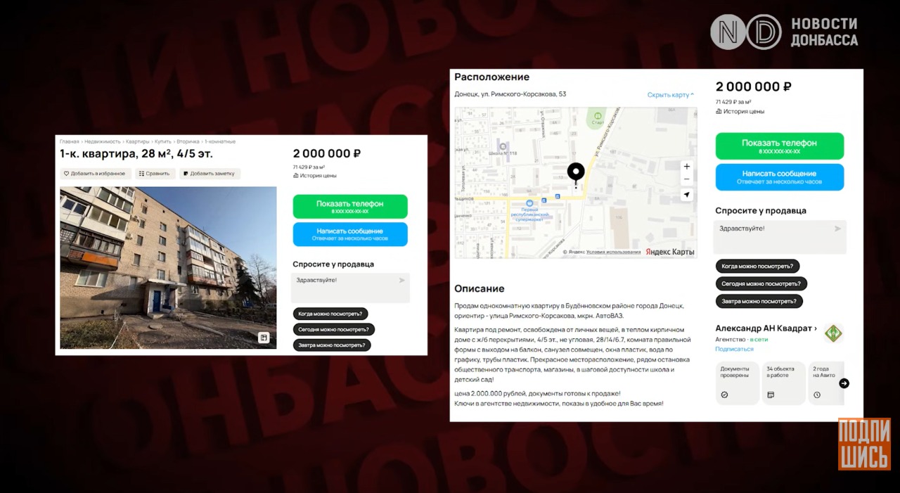 После того, как Россия якобы признала захваченные территории своими и аннексировала их в сентябре 2022 года, цены на недвижимость там резко взлетели. Тут прежде всего речь о частях Донецкой и Луганской областей. Например, ранее, шесть-семь лет назад стоимость двухкомнатной квартиры не в центре Донецка едва доходила до десяти тысяч долларов. Сейчас это 30-40 тысяч. Такие ценовые скачки сыграли злую штуку с теми, кто выехал из оккупации еще в 2014-2015 годах. Продавать за бесценок свое жилье многие не хотели. Но сейчас, когда цены выросли, сделать это практически невозможно. Ведь никакие доверенности для продажи не работают. То есть, людям нужно не просто приехать в свой оккупированный город, но также получить российский паспорт и зарегистрировать жилье в реестре РФ.