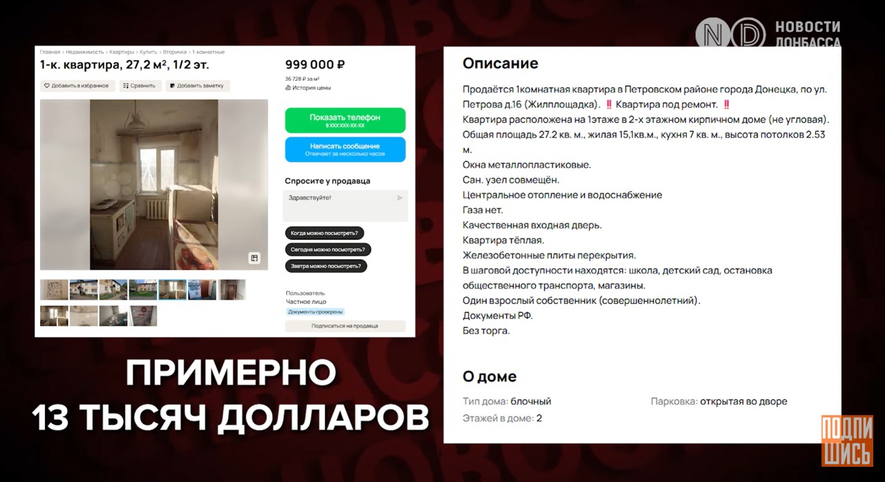 Продают жилье и буквально в паре километров от разрушенной Марьинки. Однокомнатная квартира, требующая ремонта и в старом доме стоит миллион рублей. В объявлении указано, что здесь есть центральное отопление и водоснабжение. Хотя с водой в Петровском районе ситуация очень тяжелая. В местных чатах люди рассказывают, что краны пустые по пять дней.