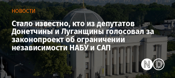 Пять депутатов-мажоритарщиков из Донецкой и Луганской областей проголосовали за законопроект № 12414, отдельные пункты которого ликвидируют независимость антикоррупционных органов НАБУ и САП.