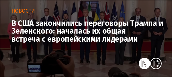 После завершения закрытой части переговоров началась общая встреча Зеленского и Трампа с европейскими лидерами и генеральным секретарем НАТО Марком Рютте. В переговорах с европейской стороны принимают участие канцлер Германии Фридрих Мерц, президент Франции Эммануэль Макрон, премьер-министр Великобритании Кир Стармер, премьер-министр Италии Джорджа Мелони, президент Финляндии Александр Стубб и президент Еврокомиссии Урсула фон дер Ляен.
