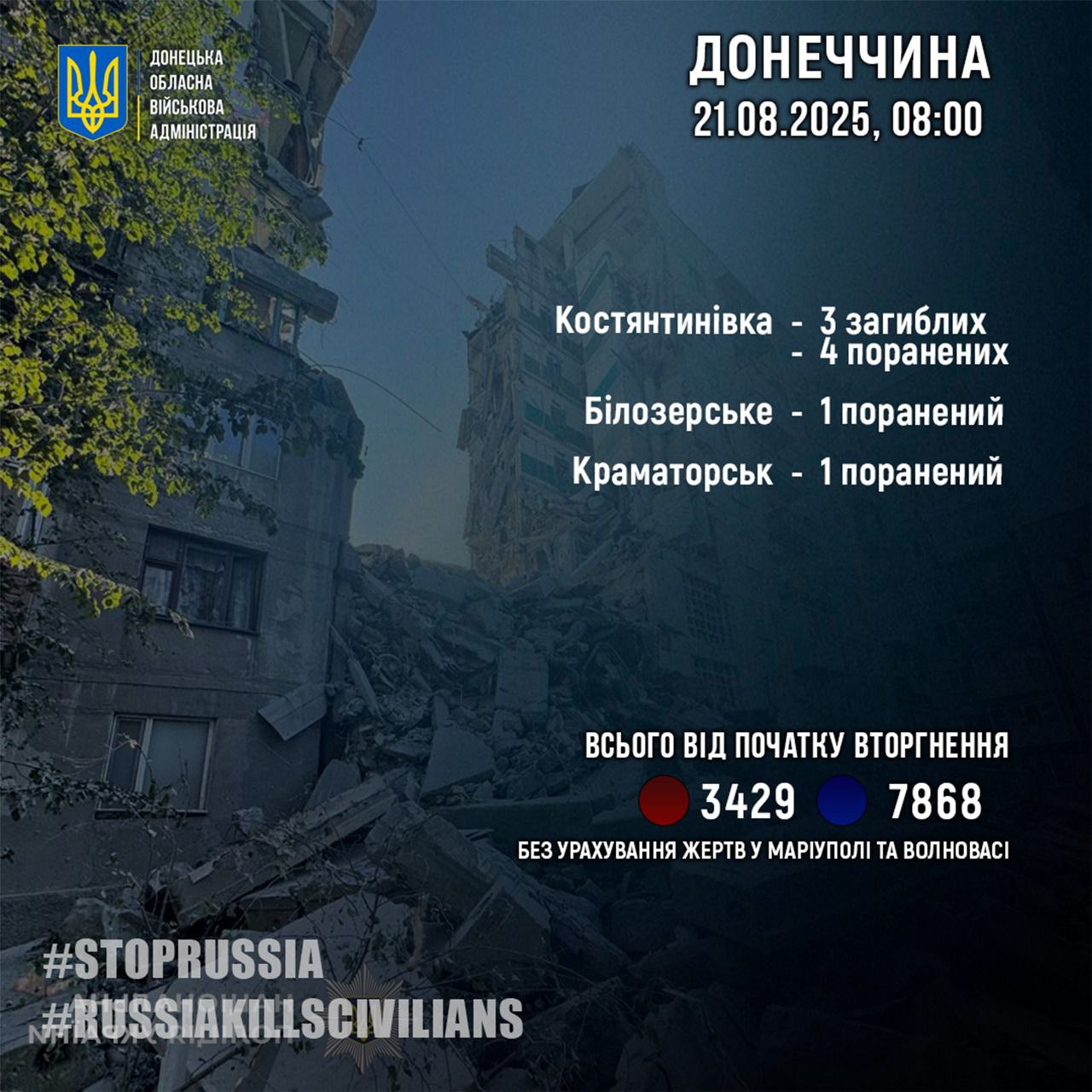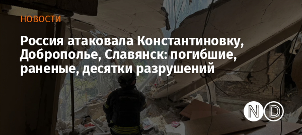 В Константиновке в результате российского обстрела погибли трое местных жителей, четверо ранены. По данным ГСЧС, повреждены 30 многоэтажных домов, 5 частных домовладений, 6 административных зданий, 2 кафе, 2 магазина, 3 объекта сферы услуг и автомобили. В одном из пятиэтажных жилых домов возник пожар.