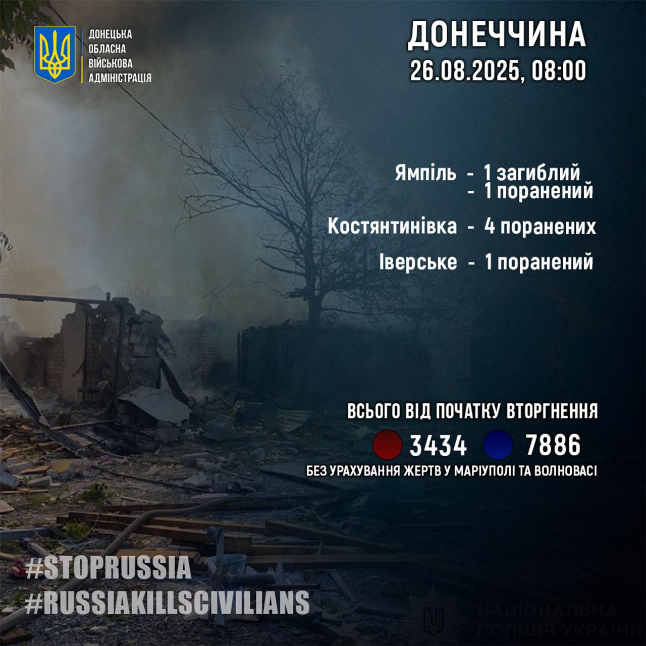 С начала полномасштабной войны в Донецкой области погибли 3434 человек, получили ранения — 7886. Общее количество жертв россиян в Донецкой области подано без учета Мариуполя и Волновахи.