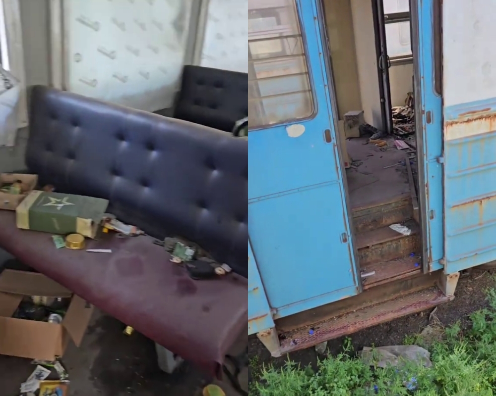 На кадрах зафиксированы разрушенные вагоны «Укрзализныци», внутри которых остались сухпайки армии РФ, разбитые окна с пулевыми отверстиями и мусор, оставленный российскими оккупантами.