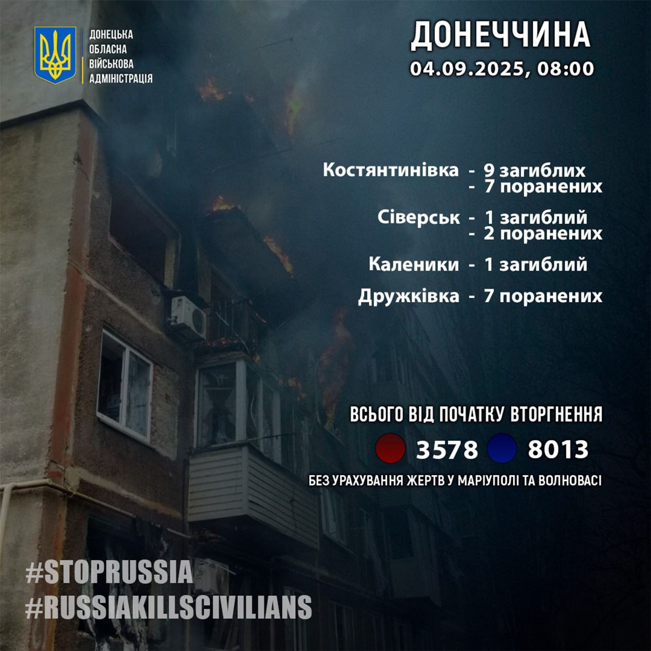 В результате обстрелов девять человек погибли в городе Константиновка, один – в городе Северск и один – в селе Каленики.