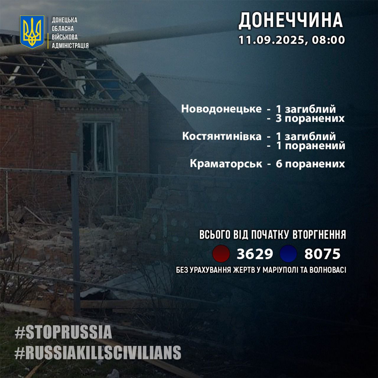 За 10 сентября россияне убили двух жителей Донецкой области – в городе Константиновка и поселке Новодонецкое. Об этом сообщил глава Донецкой областной военной администрации Вадим Филашкин.