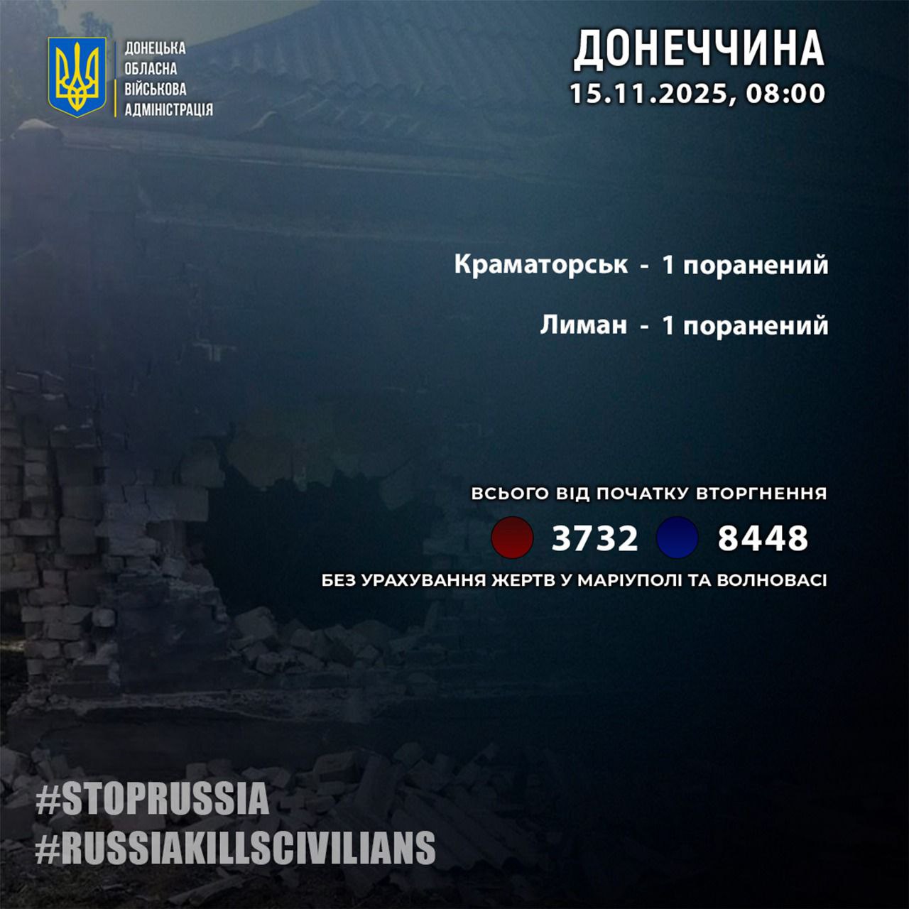 С начала полномасштабной войны в Донецкой области погибли 3732 человека, получили ранения — 8448. Общее количество жертв россиян в Донецкой области представлено без учета Мариуполя и Волновахи.