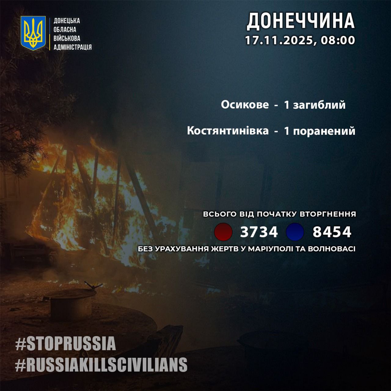 «За 16 ноября россияне убили 1 жителя Донецкой области — в Осиковом», — отметил он.