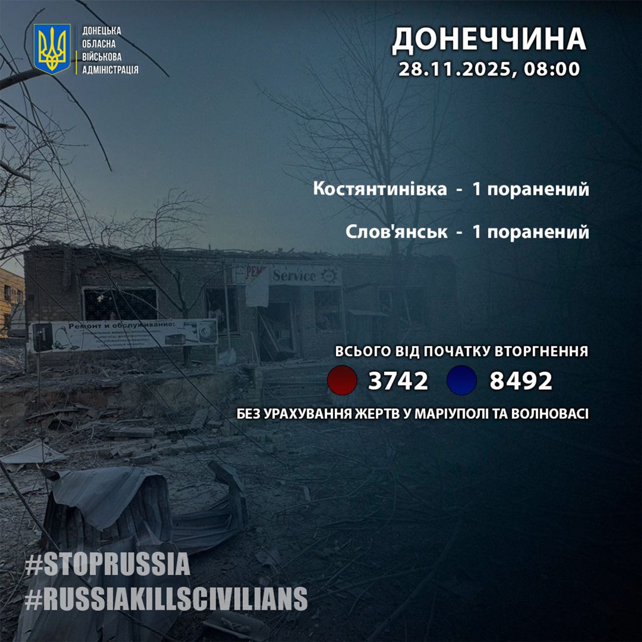 За 27 ноября россияне ранили двух жителей Донецкой области. Об этом сообщил глава Донецкой областной военной администрации Вадим Филашкин.