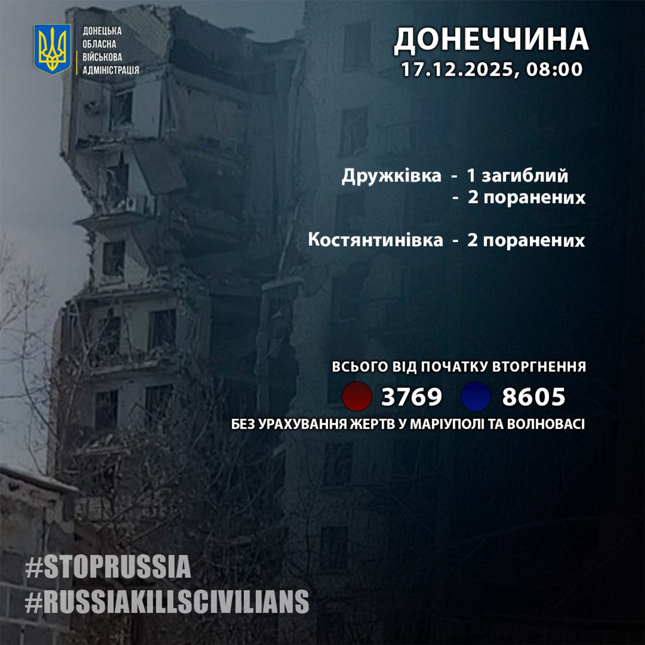 За 16 декабря россияне убили одного жителя Донецкой области – в городе Дружковка. Об этом сообщил глава Донецкой областной военной администрации Вадим Филашкин.