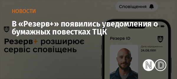 В приложении «Резерв+» внедрена новая функция — пользователи могут включить уведомления о том, что территориальный центр комплектования и социальной поддержки направил бумажную повестку почтовым отправлением. Об этом сообщает пресс-служба Министерства обороны Украины.