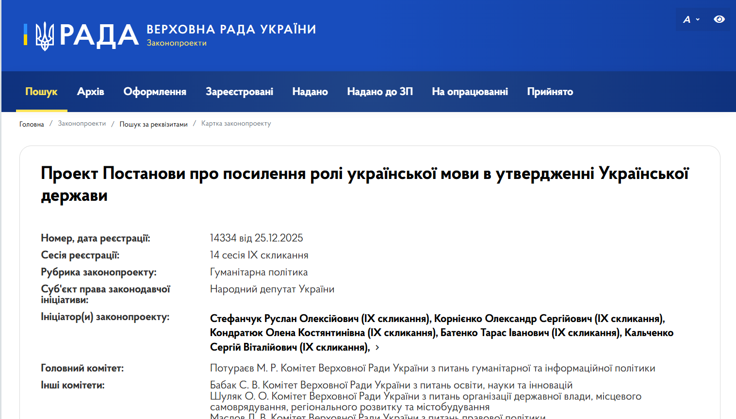 Комитет гуманитарной политики Верховной Рады единогласно поддержал инициативу, направленную на преодоление последствий советской русификации украинского законодательства, сообщается в Telegram-канале парламента.