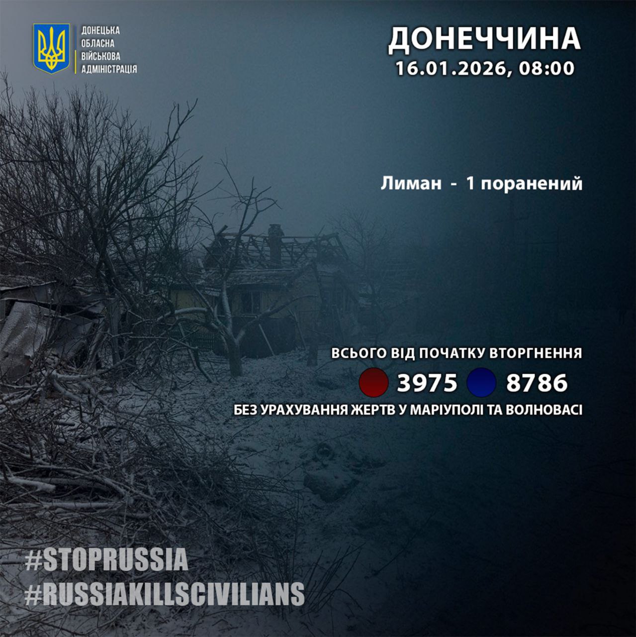 С начала полномасштабной войны в Донецкой области погибли 3975 человек, получили ранения — 8786. Общее количество жертв россиян в Донецкой области подано без учета Мариуполя и Волновахи.