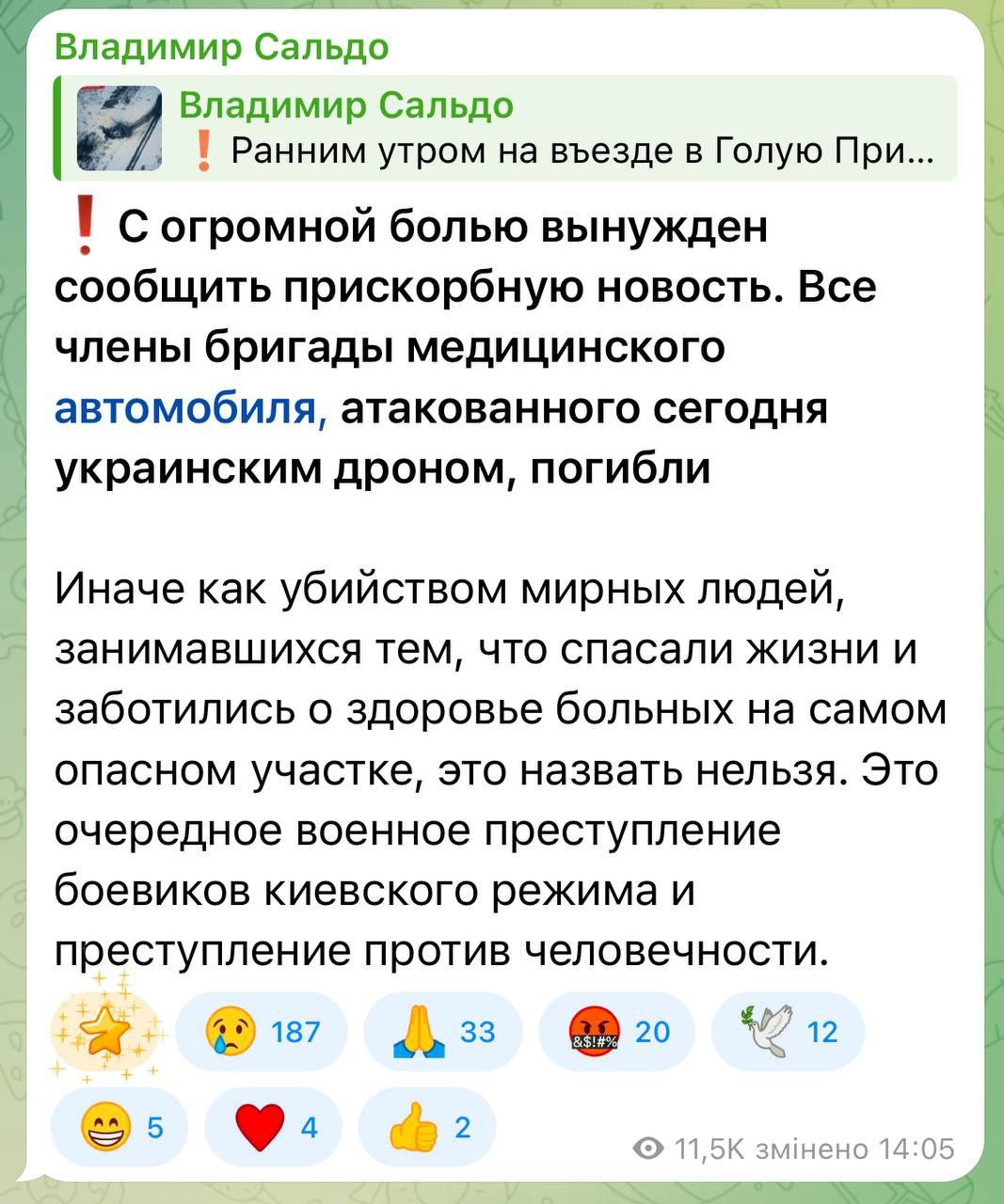 Утром так называемый «губернатор» Херсонской области Владимир Сальдо опубликовал сообщение, в котором заявил, что автомобиль с медиками якобы был атакован дроном ВСУ.
