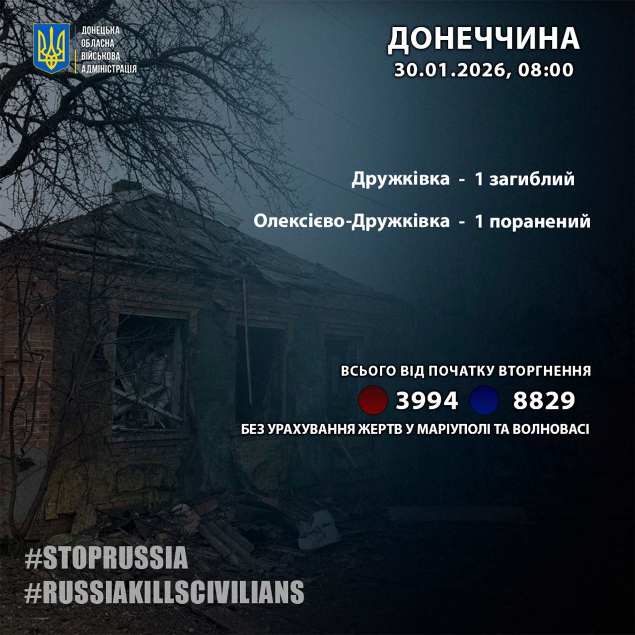 За 29 января россияне убили одного жителя Донецкой области – в городе Дружковка. Об этом сообщил глава Донецкой областной военной администрации Вадим Филашкин.