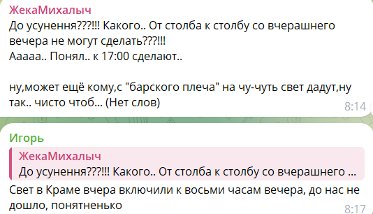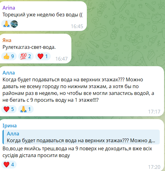В комментариях местные жители отмечают, что перебои с электроэнергией в городе продолжаются уже около трех недель. По их словам, свет подают нерегулярно — «иногда на 50 минут в сутки, иногда на два часа».