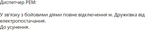 Диспетчер Дружковской РЭМ сообщил о полном отключении города Дружковка от электроснабжения. По информации, обесточивание произошло «в связи с боевыми действиями» и продлится до устранения последствий.