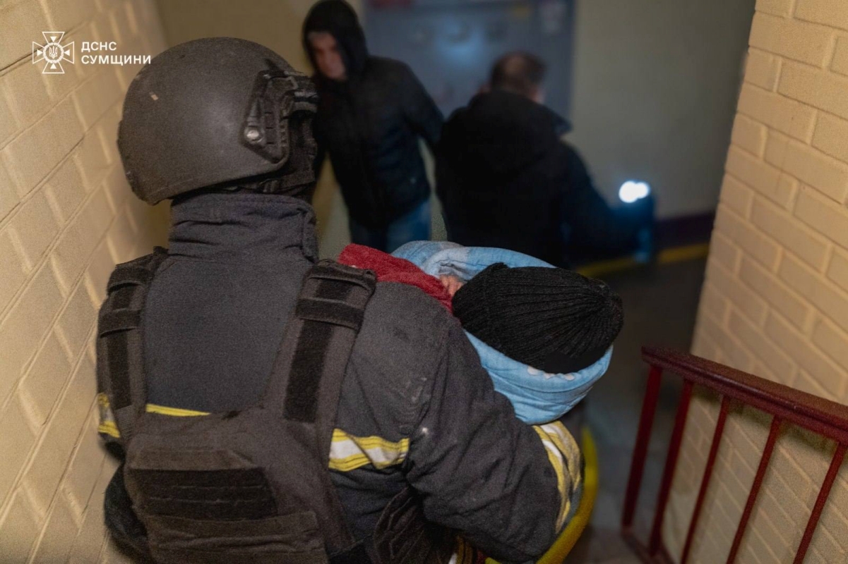 Спасатель выносит ребёнка из горящего здания после обстрела РФ.