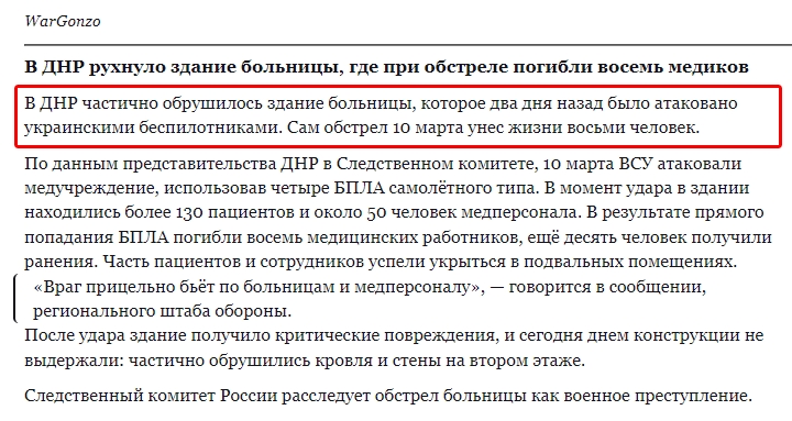 Российский Telegram-канал WarGonzo сообщил, что в результате удара погибли восемь человек. По его данным, в здании находились около 130 пациентов и примерно 50 человек медицинского персонала.