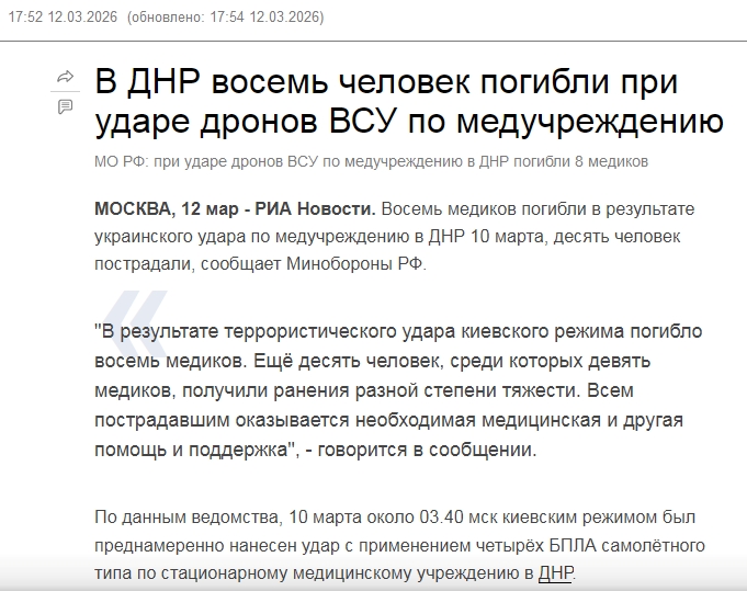 Позже, 12 марта, российские источники сообщили о десяти раненых. Утверждается, что среди них девять «медицинских работников» и один пациент.